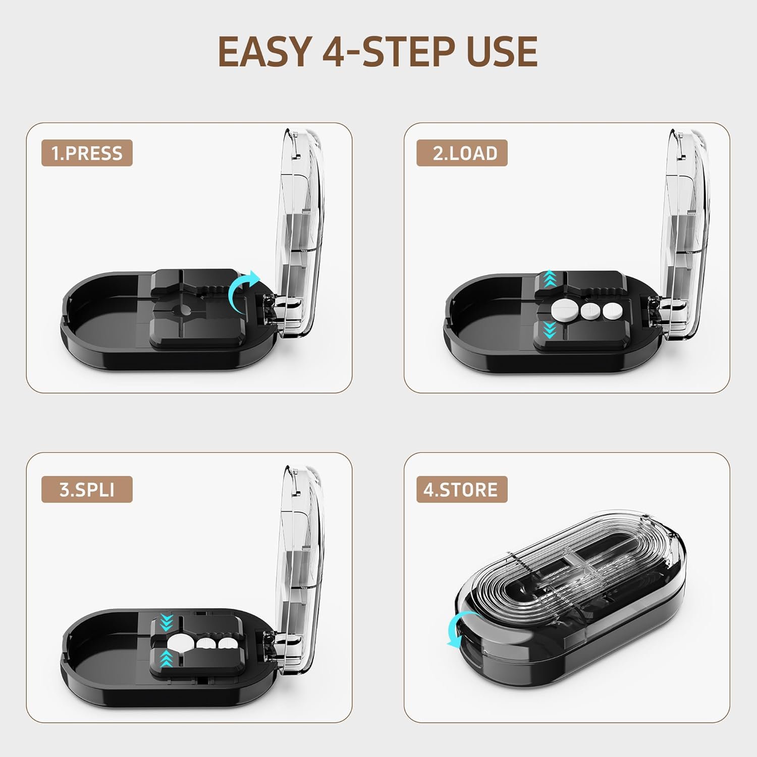 Place the tablet in the middle, cover the lid, and press it down. The tablet cutter can easily and perfectly cut into 1/2, 1/4 tablets.