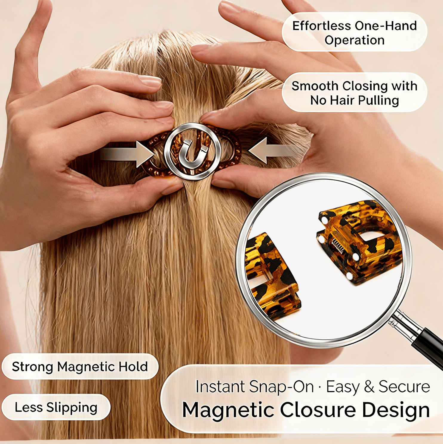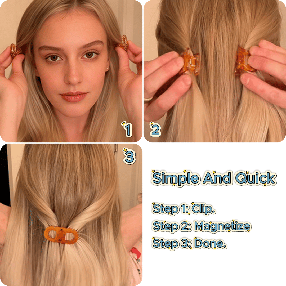 Two clips snap together with strong magnets, keeping your side hair perfectly in place. No more strands falling apart 🔄 — neat, balanced, and effortless all day.