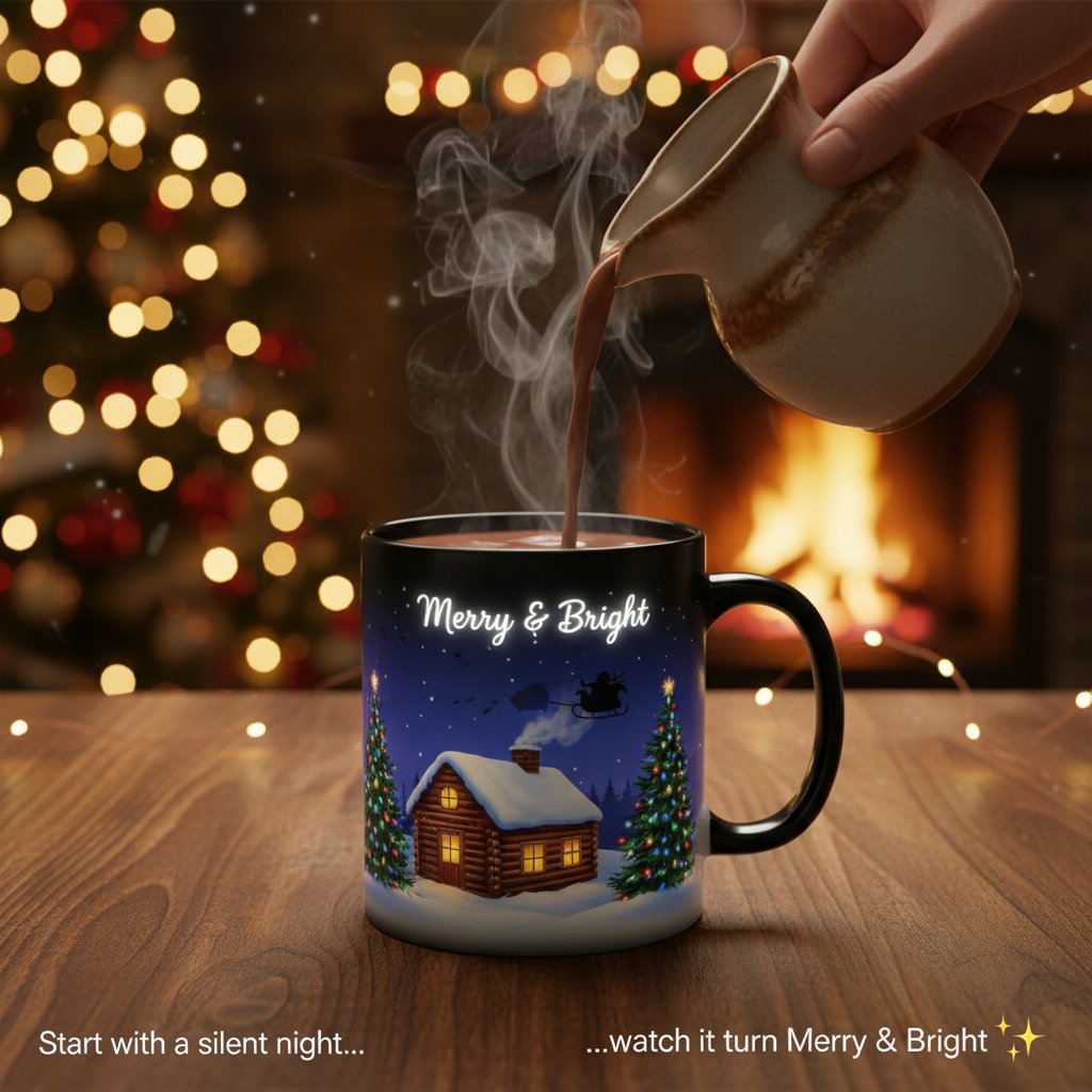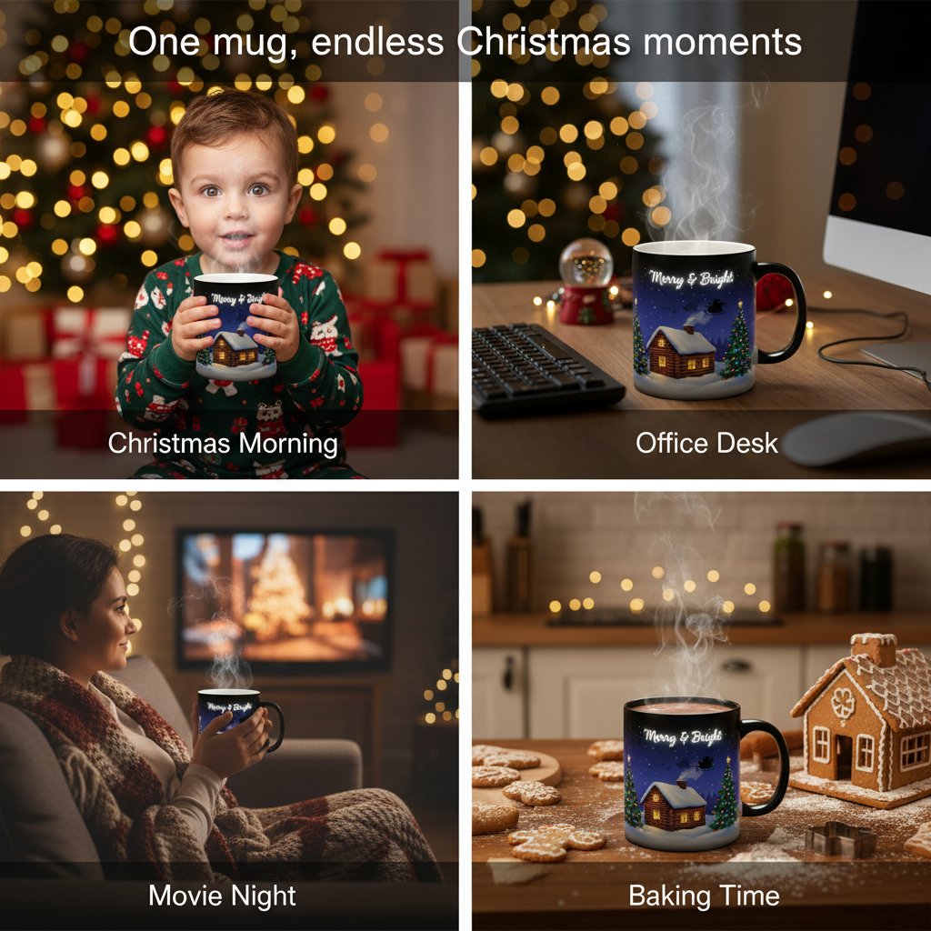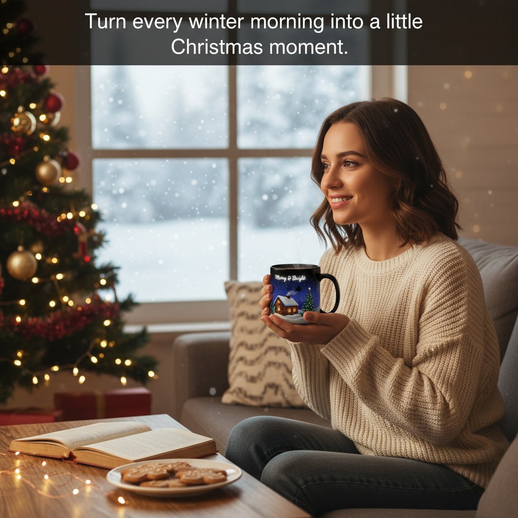 On the shelf, it looks like a sleek, matte dark mug with a calm, snowy “Silent Night” scene. But the moment you add something hot, it turns an ordinary cup of coffee into a tiny Christmas show